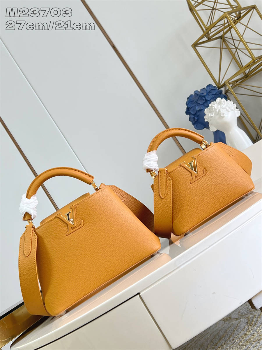【独家实拍 M23703橙色/迷你 】 本款 Capucines 迷你手袋为 Taurillon 牛皮革渲染浓郁色调,再以手柄环和 LV 字母完善瞩目设计。袖珍尺寸浓缩经典构型,可拆卸肩带成就舒适肩背和斜挎体验。BKFK BBFK
