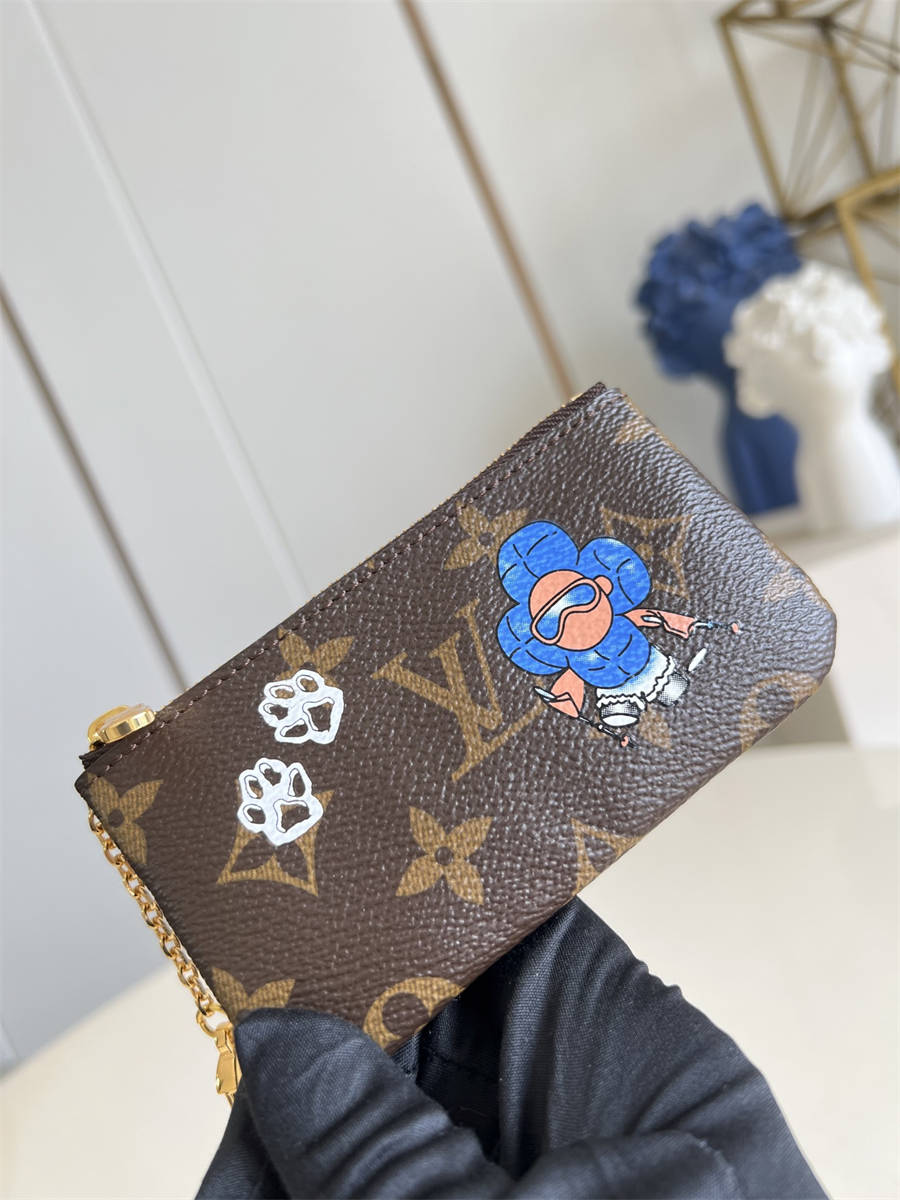 CKK【独家实拍 M15341 】Vivienne Wintery Travel 系列推出此款钥匙零钱包,以 Monogram 帆布呈现品牌吉祥物的萌趣插画和爪印图案,搭配莹泽钥匙钩扣和皮革内衬,令经典设计流露灵动格调。7 x 1.5 x 12 厘米 (高 x 宽 x 长度)