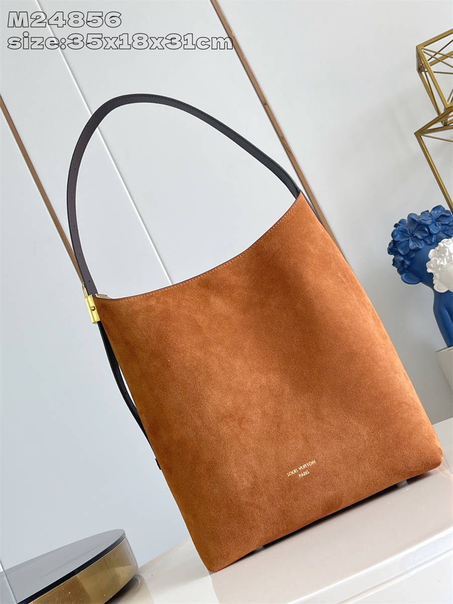 BKKK【独家实拍 M24856棕绒 】M25516 本款 low key Hobo 中号手袋取材柔滑绒面牛皮革,以品牌利落构型回溯 1970 年代的波西米亚美学。皮革饰边与做旧金属挂锁升级考究格调,内袋和可拆卸 Monogram 收纳袋令日常小物轻松随行。35 x 18 x 31 厘米 (高 x 宽 x 长度)