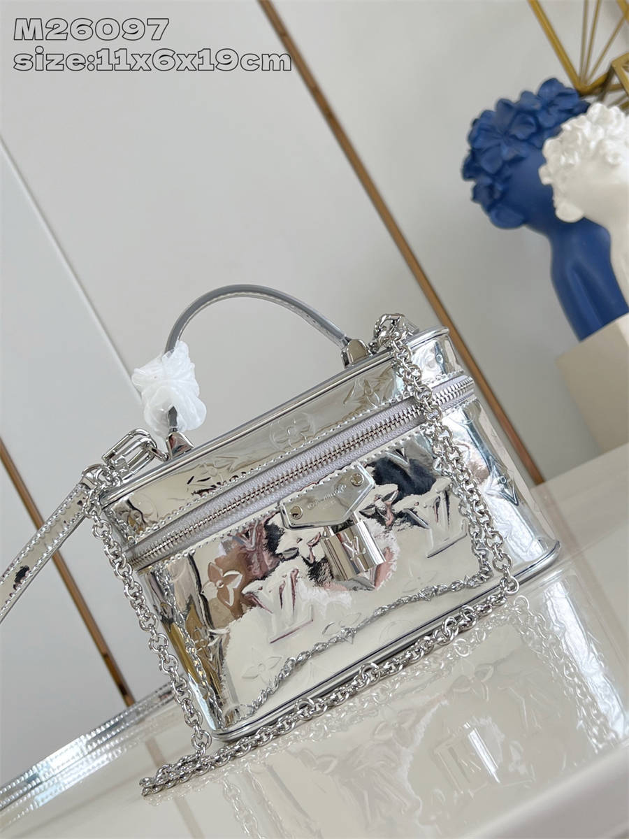 HFK【独家实拍 M26097 】本款 Vanity Chain Pouch 手袋出自 LV Ski 系列,向品牌传统化妆箱汲取灵感,以 Monogram Miroir 帆布诠释旅行精神。LV 字母铭纹挂锁、可拆卸肩带和链条彰显考究细节,恰宜构型可轻松容纳小型零钱包和太阳眼镜等日常所需。11.5 x 6.5 x 19 厘米 (高 x 宽 x 长度)