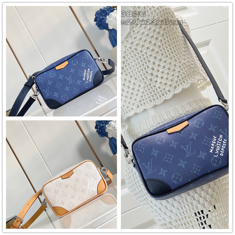 FHK【独家实拍 M26826蓝 】本款 Trocadéro 迷你手袋取材 Monogram Heritage 涂层帆布,搭配棉质内衬,并以牛皮革勾勒加固包角、正面贴饰和拉链头。可收纳手机等小巧物件。可拆卸并调节的肩带提供肩背和斜挎选择。20 x 13 x 6.5 (厘米) (长 x 高 x 宽)