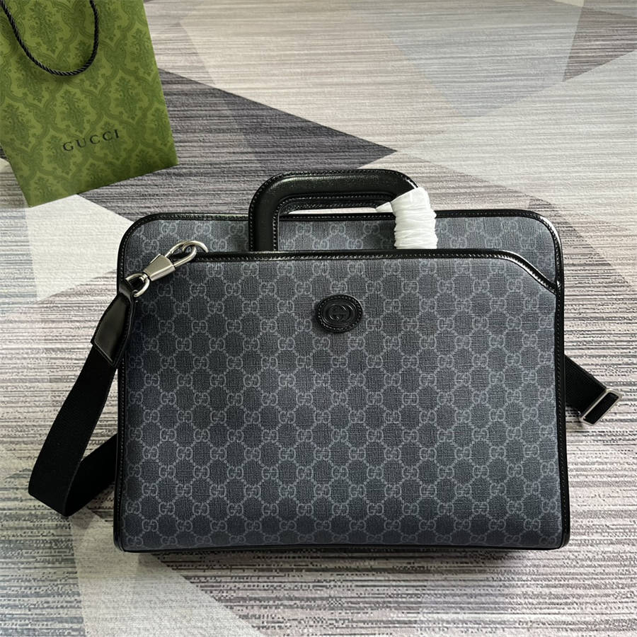 GFK(配专柜礼品袋)互扣式双G公文包,GG Supreme帆布是品牌经久不衰的经典材质。它采用带涂层的超细纤维织物制成,质感柔软且富有弹性。这款公文包采用这一材质的黑色版本呈现。互扣式双G标牌令整款设计倍添魅力,强调品牌魅力的标识底蕴。黑色GG Supreme帆布,黑色皮革滚边,棉麻衬里