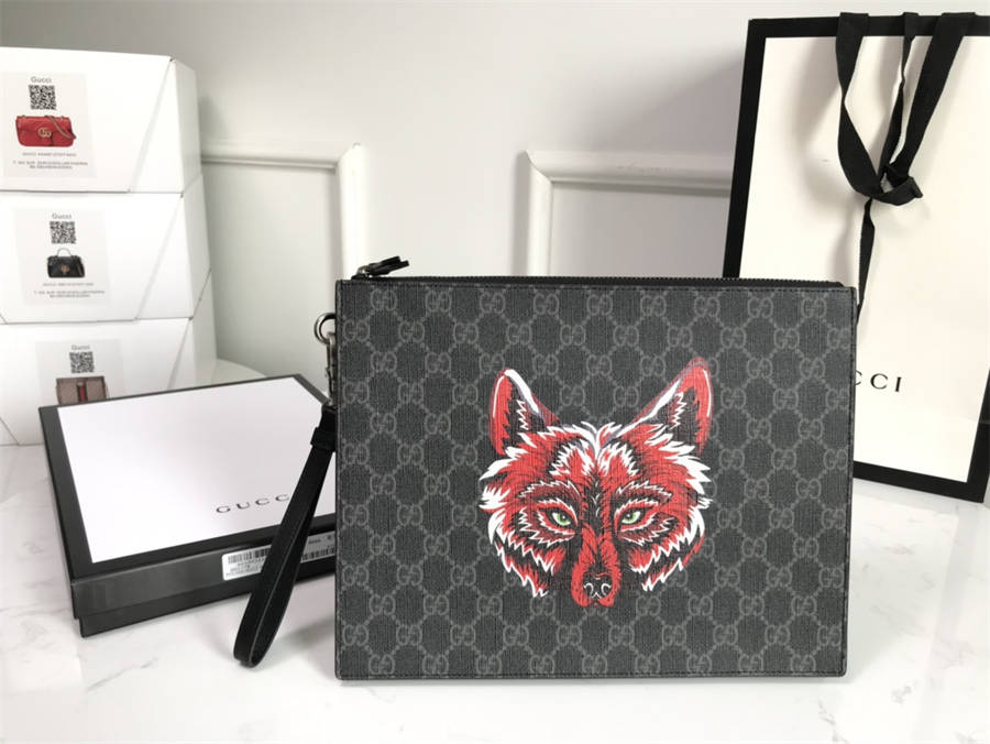 CJK【配置全套包装】 G家原单!正品开模制作,对版规格、对版内里做法,市场独家,印花GG 、图案已成为品牌标志之一,印花装饰于此款手包的中央!可拆卸意大利皮制腕带!内里侧面底部均顶级牛皮制作而成型号:547084,颜色:黑PVC狼头,尺寸:28*22*3.5。