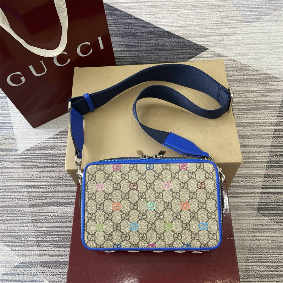 这款包袋以GG字母交织图案涂层织物打造,缀饰通体多色印花和同色调滚边。